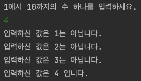 4를 입력해 4라는 것을 찾은 후 반복문에서 빠져나왔습니다.